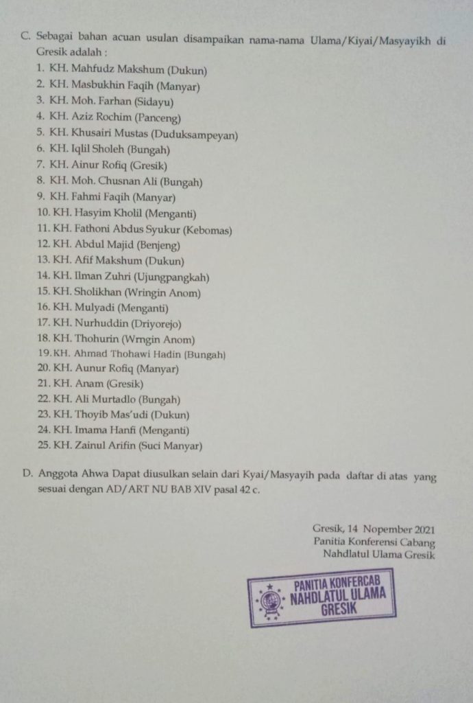 Dari draft tata tertib Konfercab NU Gresik Tahun 2021 yang akan digelar di Pondok Darul Ihsan Menganti Gresik pada 5 Desember nanti, tercantum nama 25 nama Ulama’ Gresik yang berasal dari berbagai MWC. 25 Nama itu dimaksudkan sebagai daftar pilihan untuk dibahas dan ditetapkan sebagai usulan Ranting Melalui MWC menjadi tim AHWA.