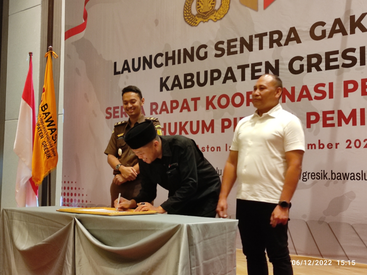 GRESIK | NUGres – Langkah mempersiapakan pesta demokrasi pada 2024 mendatang dilakukan Badan Pengawas Pemilu (Bawaslu) Kabupaten Gresik, yakni dengan meluncurkan Sentra Gakkumdu (Penegakan Hukum Terpadu) pada Selasa (6/12/2022) siang, di salah satu hotel Kabupaten Gresik.