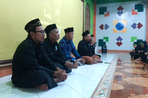 Puluhan Pengurus dan anggota Pagar Nusa Anak Cabang Gresik terlihat khidmat membaca doa di Aula TK 8 Muslimat NU Kelurahan Lumpur, Gresik. Selain itu terlihat hadir sesepuh Pagar Nusa.